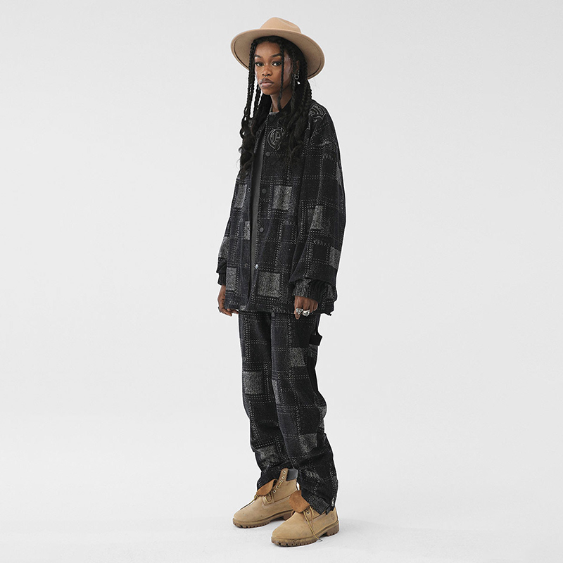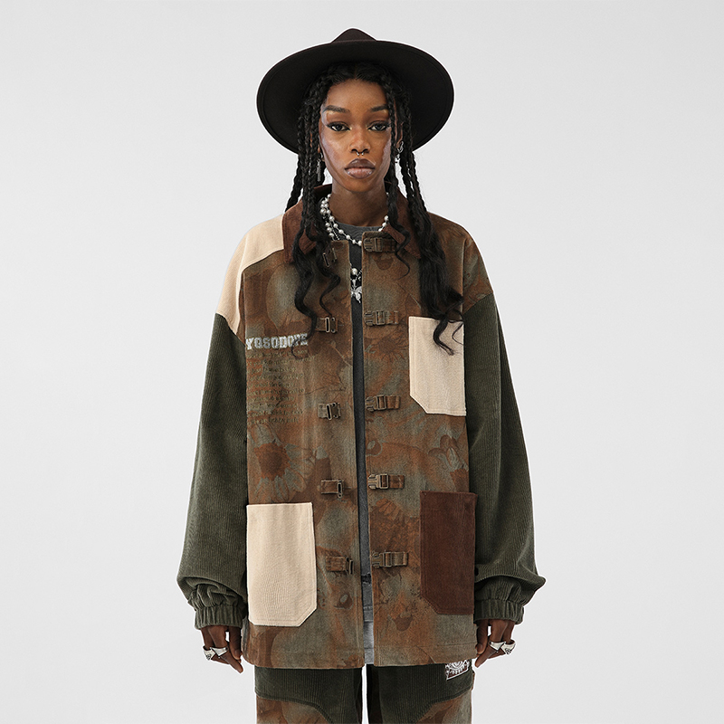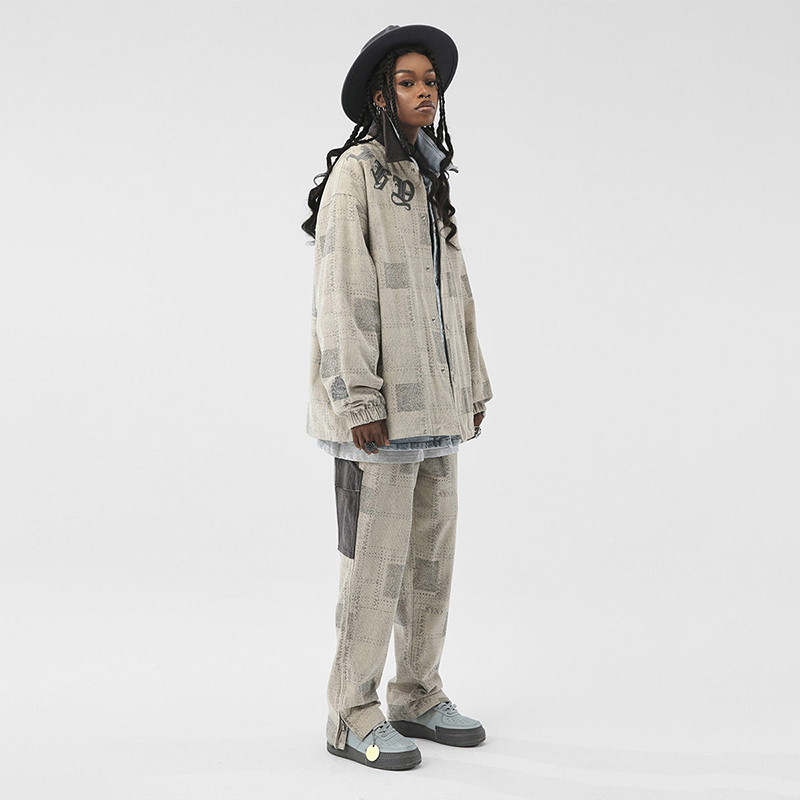 Retro checked embroidery Cordycase outer set Men’s loose casual workers jacket set